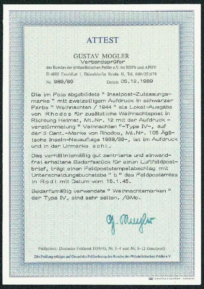 | Zusatzinformationen und Suchstichworte: | Gert Müller 121. Auktion 22. Februar 2024 Los 5101 Deutsche Besetzung II. WK, Feldpostmarken Insel Rhodos, Weihnachts-Zulassungsmarke für Luftfeldpostbriefe 1944, seltene Aufdrucktype IV (Weihnachten), farbfrisch und gut gezähnt, sauber gest. "FELDPOST b 15.1.45." vom Feldpostamt in Rodi. Ein Luxusstück dieser Feldpost-Seltenheit! Ausruf 1.500,00EUR |
