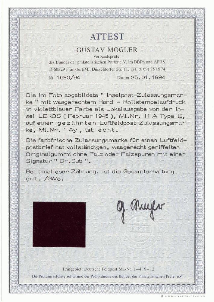 | Zusatzinformationen und Suchstichworte: | 234. Auktion Karl Pfankuch & Co. 10. - 11. April 2024 Los 1555 Deutsche Besetzung II. WK, Feldpostmarken Insel Leros: Feldluftpost-Zulassungsmarke Type A II, tadellos Ausruf 400,00 EUR |