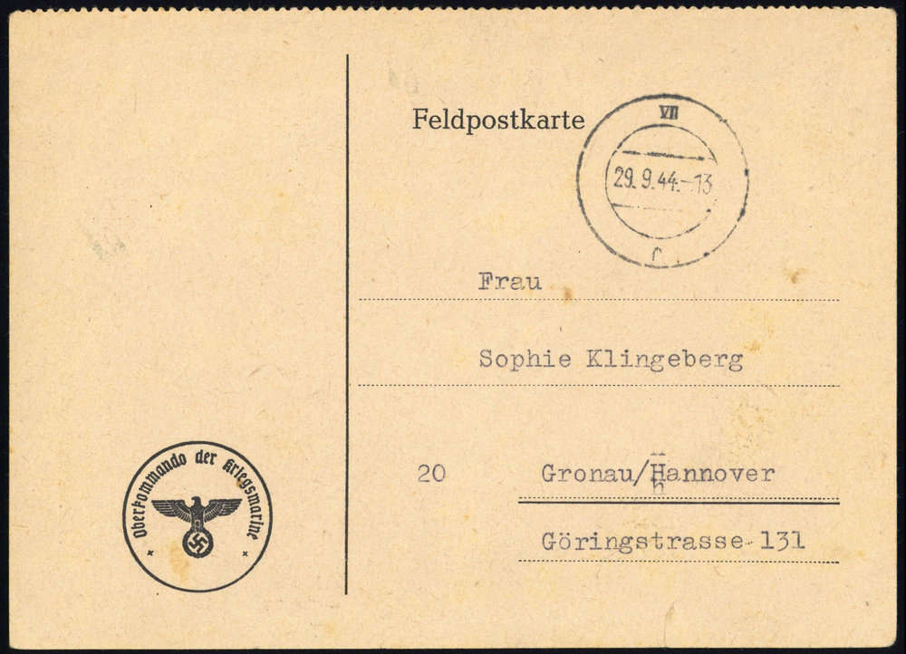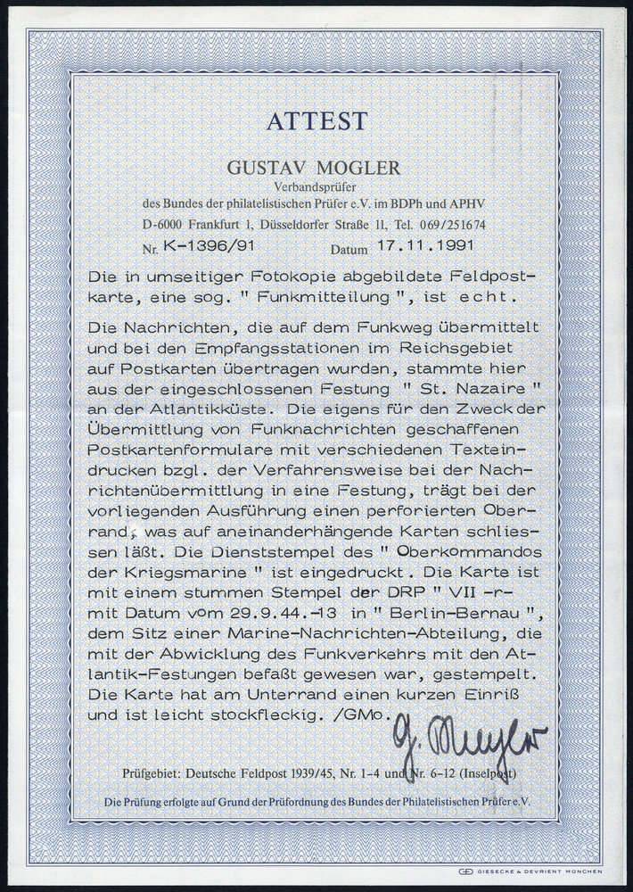| Zusatzinformationen und Suchstichworte: | DBA Freiburg GmbH Los 1670050647 Feldpost II Wk ST: NAZAIRE: 1944, Funkmitteilungskarte mit stummem Stempel "VII 29.9.44 r" nach Gronau, Alterungs- und Beförderungsspuren, Festpreis 150,00 EUR |