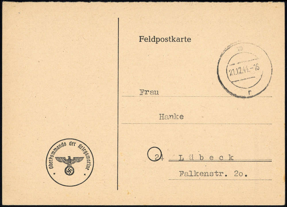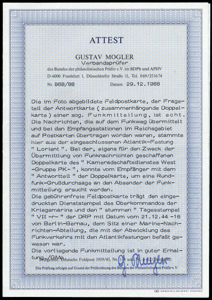 | Zusatzinformationen und Suchstichworte: | DBA Freiburg GmbH Los 1670050648 Feldpost II Wk LORIENT: 1944, Funkmitteilungskarte mit stummem Stempel "VII 21.12.44 r" nach Lübeck Festpreis 150,00 EUR |