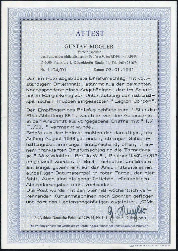 | Zusatzinformationen und Suchstichworte: | DBA Freiburg GmbH Los 1671400525 Feldpost II Wk LEGION CONDOR: 1937, Brief aus dem Deutschen Reich mit Inhalt an einen Angehörigen der "Legion Condor" mit Chiffre "I./F./88" ohne Eingangsvermerk und Absenderangaben, interessanter Schriftverkehr des Empfängers Festpreis 400,00 EUR |