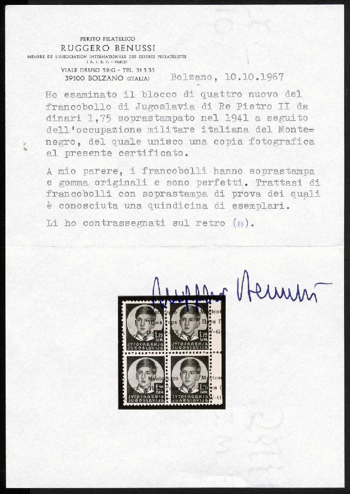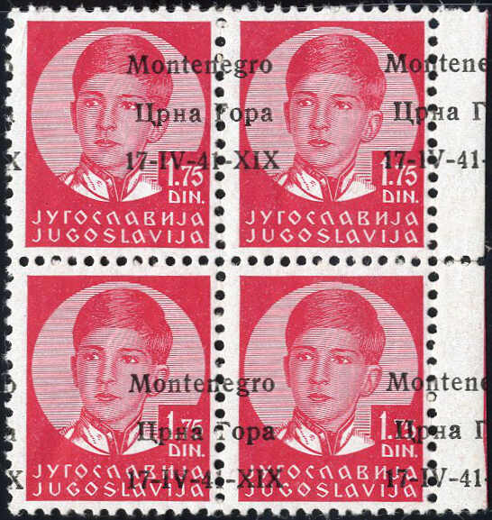 | Zusatzinformationen und Suchstichworte: | Viennafil 83. Live-Auktion 21. - 23. November 2023 Los 628 Italien Besetzung II. WK Montenegro 1942, Re Pietro, non emesso, 1,75 carminio, quartina bordo destro nuova con gomma integra Zuschlag 220,00 EUR |