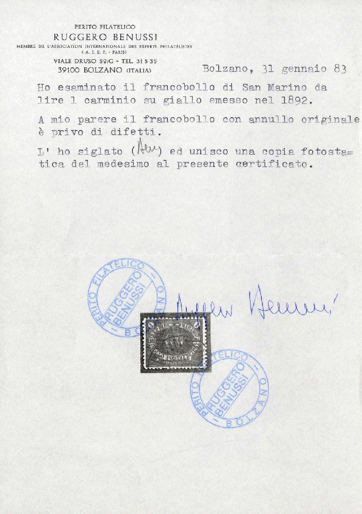 | Zusatzinformationen und Suchstichworte: | Viennafil 87. Auktion - online Live 23. April 2024 Los 16914 San Marino 1892/94, 1 Lira carminio su giallo Ausruf 100,00 EUR |