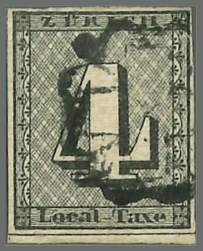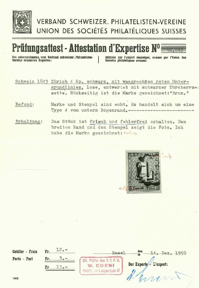| Zusatzinformationen und Suchstichworte: | Rapp Auktion 2023 14. - 18. November 2023 Los 4 Schweiz Kanton Zürich Type IV, farbenfrisch mit gut sichtbaren Unterdrucklinien, breite Ränder, unten mit Bogenrand und schwarzer Rosette schön entwertet. Absolut fehlerfreie Marke mit dazugehörenden Attesten von Cueni, Hunziker und Eichele. ZH 4 Marken mit schwarzen Rosetten sind sehr selten Zuschlag 5.000,00 CHF |