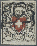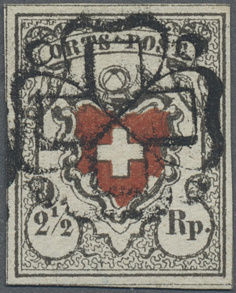 | Zusatzinformationen und Suchstichworte: | Christoph Gärtner 58. Auktion 19. - 23. Februar 2024 Los 3516 D Schweiz Orts-Post 1850, Ortspost 2½ Rp. schwarz/rot mit Kreuzeinfassung, Type 10, farbfrisches, allseits voll- bis breitrandiges Exemplar, klar und voll entwertet durch schwarzer Zürcher Rosette Zuschlag 560,00 EUR |
