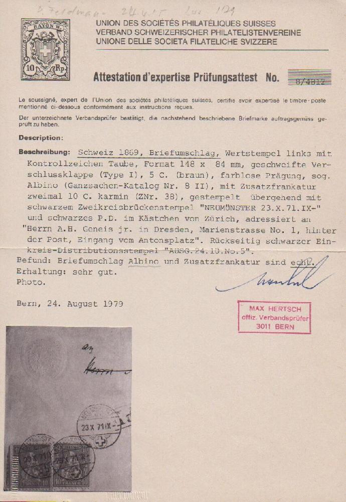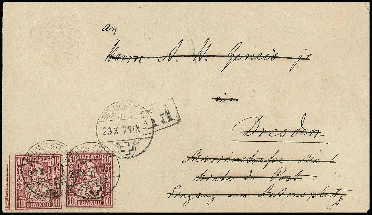 | Zusatzinformationen und Suchstichworte: | Rauhut & Kruschel - 223. Auktion 9. März 2024 Los 4022 Schweiz 10 C. karmin, zwei perfekte Exemplare auf "Tübli"-Ganzsache 5 C., diese mit fehlendem Wertstempel-Eindruck, nur die Prägung vorhanden (sog. "Albino"), 1871 von Neumünster nach Dresden, Couvert ganz zarte Mittelfalte, sehr seltene und nur in wenigen Exemplaren bekannte Ganzsachen-Abart Ausruf 600,00 EUR |