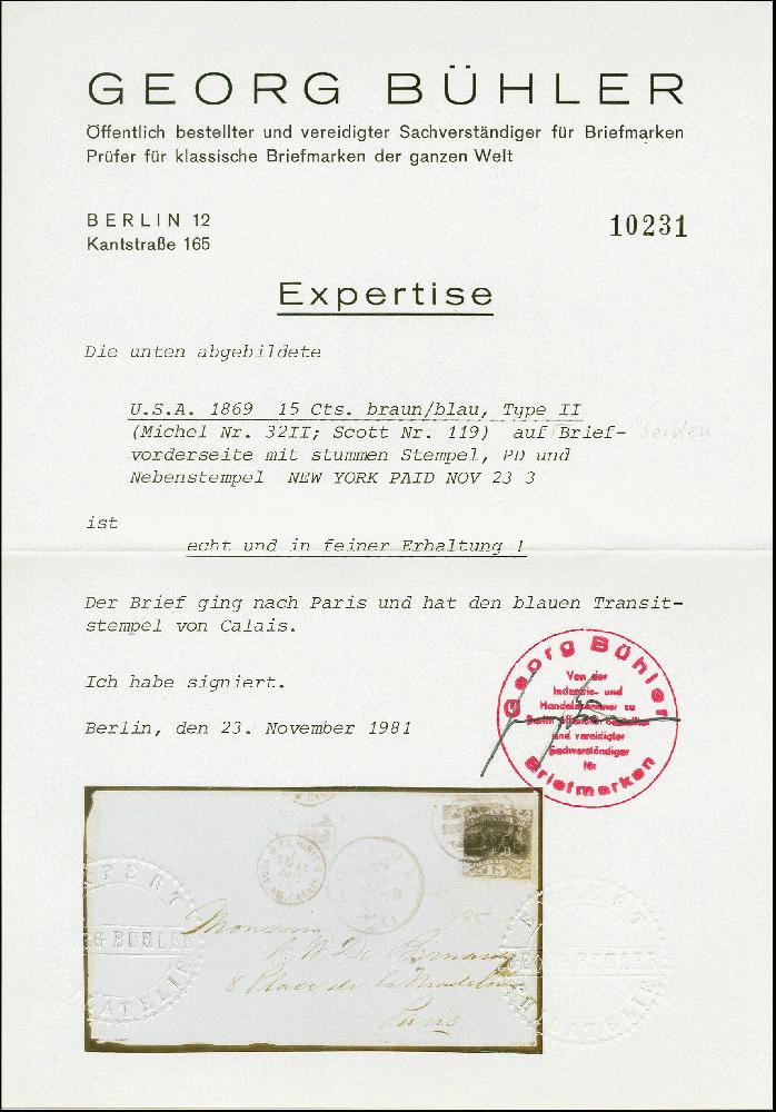 | Zusatzinformationen und Suchstichworte: | 383. Auktion Heinrich Köhler 14.–15. & 18.–23. März 2024 Los 1824 Frankreich 1869, illustriert 15 c. braun/blau, Type II, entwertet mit stumme Barren Kreis an einen Brief nach Frankreich mit rotem Kreisdatumsstempel. "BOSTON 30 NOV PAID", "PD" und blau Ankunftsdatumsstempel. "ET.-UNIS 13 DEC 69", ein belanglose getönt Zähnung, einige kleine Umschlagmängel wegen der fragilem pelure Natur des Papiers, noch schön, Ausruf 100,00 EUR |