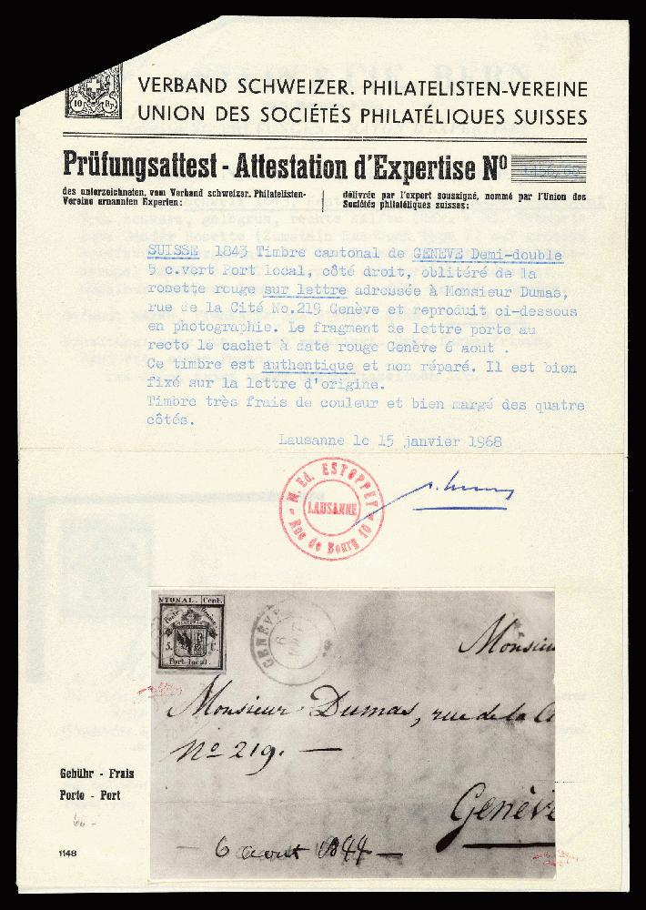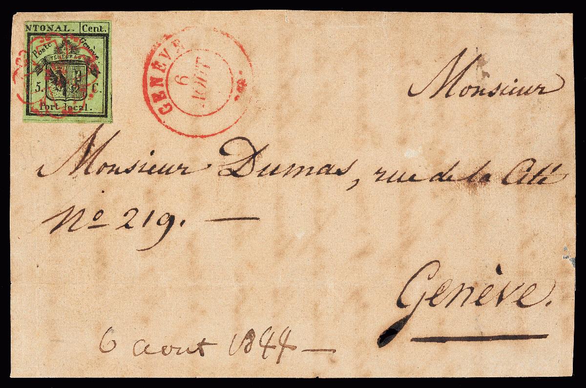 | Zusatzinformationen und Suchstichworte: | R&J Stamp - 2. Auktion 27. Januar 2024 Los 39 Schweiz Kanton Genf 1843: Halbe Doppelgenf. Briefvorderseite von Genève im Ortsrayon. Frankiert mit farbfrischer, breit geschnittener rechter Hälfte und übergehend mit roter Rosette entwertet. Gute Erhaltung Ausruf 6.000,00 CHF |