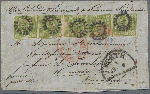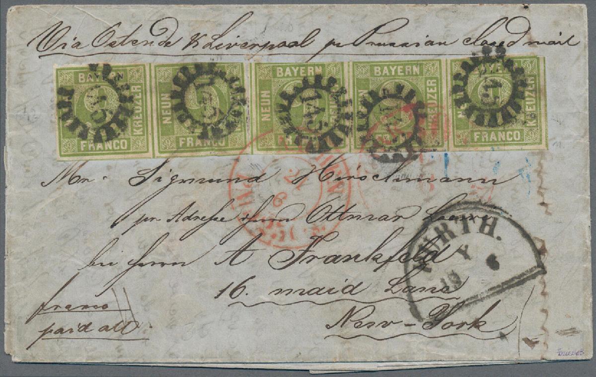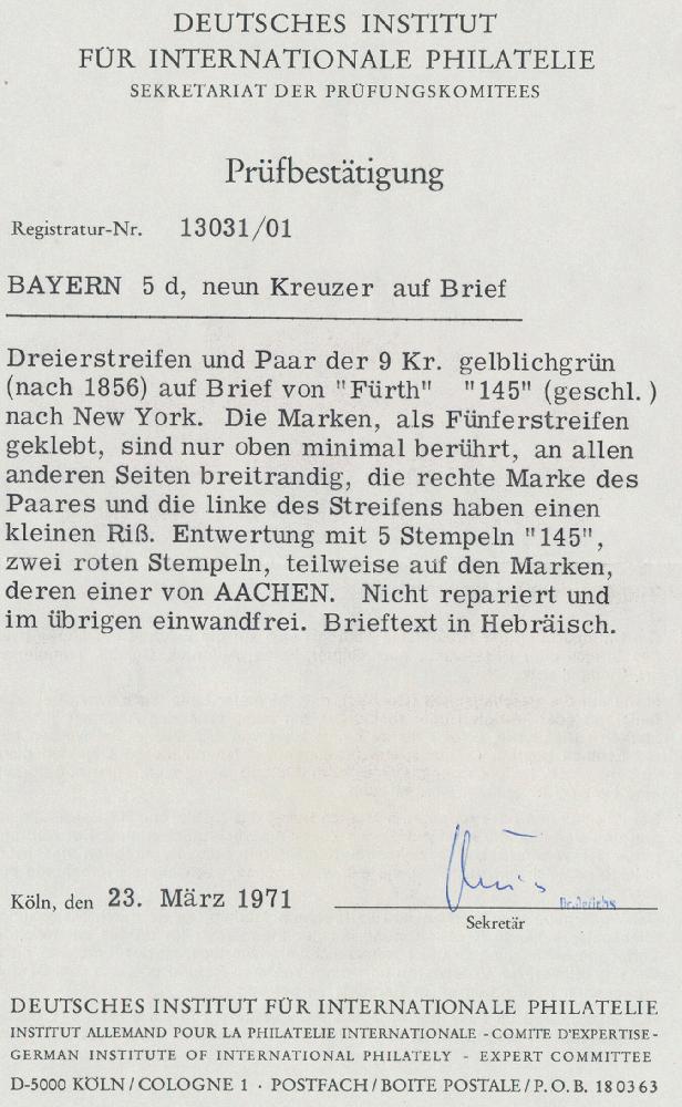 | Zusatzinformationen und Suchstichworte: | Christoph Gärtner 58. Auktion 19. - 23. Februar 2024 Los 4095 D Altdeutschland Bayern 1850, "9 Kr gelbgrün", beeindruckende und attraktive 45 Kr-Mehrfach-Frankatur in Form eines Paares und Dreierstreifens auf Faltbrief von FÜRTH über AACHEN nach New York in guter Bedarfserhaltung. Die Frankatur teils oben minimal berührt, ansonsten voll/breitrandig, die rechte Marke des Paares und die linke des Streifens mit kleinem Riß, jeder Wert mit klarem gMR "145", der Beleg vs./rs. mit diversen Beförderungs- und Transitstempeln. Ein wirklich schöner Beleg eines hochtarifigen Transatlantikbriefes(Brieftext in Hebräisch) Zuschlag 720,00 EUR |
