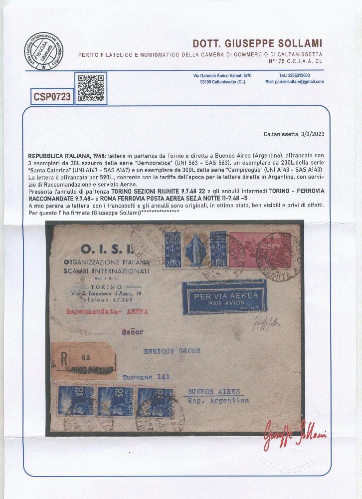 | Zusatzinformationen und Suchstichworte: | Bertolami Fine Arts 284. Web-Auktion 12. Januar 2024 Los 406 Italien Republik 09.07.1948 - Busta spedita da Torino per l'Argentina ed affrancata per 590 Lire tramite un valore da 200l. Santa Caterina n.A147 più complementari. Secondo il certificato l'affrancatura è coerente con la tariffa per le lettere spedite in Argentina con servizio aereo raccomandato. Ausruf 150,00 EUR |
