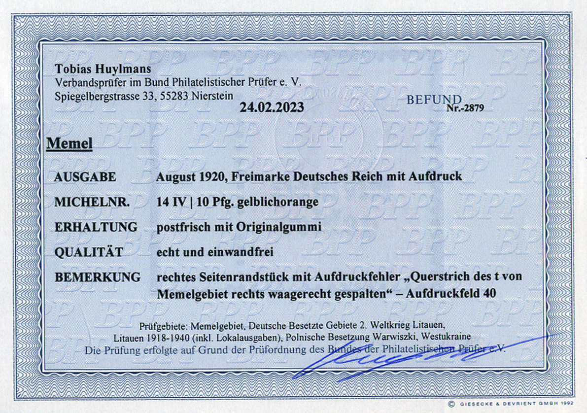 | Prüfer: | Huylmans, Tobias (BPP (Bund Philatelistischer Prüfer)) |