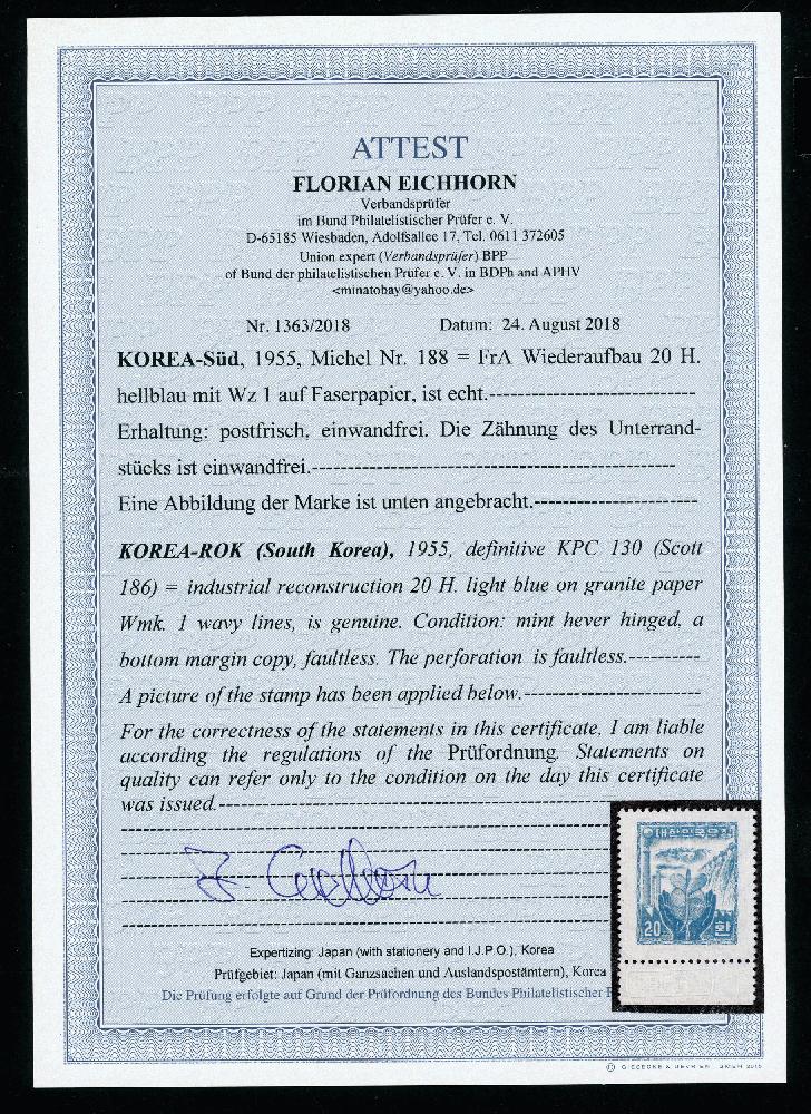 | Zusatzinformationen und Suchstichworte: | Klüttermann - 7. Auktion 25. Januar - 2. Februar 2024 Los 10628 Korea Süd 20 H. Wiederaufbau hellblau, tadellos postfrisches Unterrandstück Zuschlag 342,00 EUR |