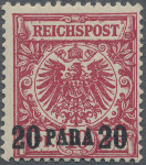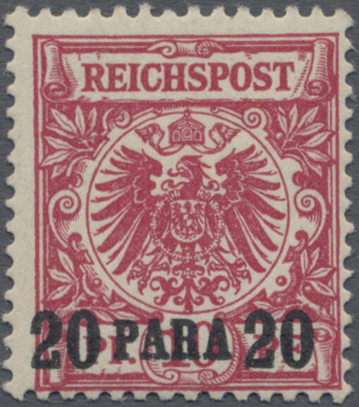 | Zusatzinformationen und Suchstichworte: | Christoph Gärtner 58. Auktion 19. - 23. Februar 2024 Los 5469 D Deutsche Auslandspost Türkei 1889, Adler, 20 P. auf 10 Pfg. dunkelrosa(rot), tadellos ungebrauchtes Prachtstück, seltene Farbnuance, Ausruf 90,00 EUR |