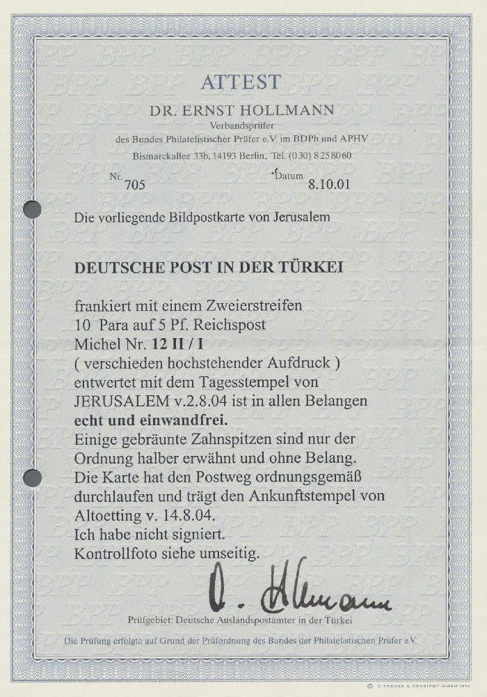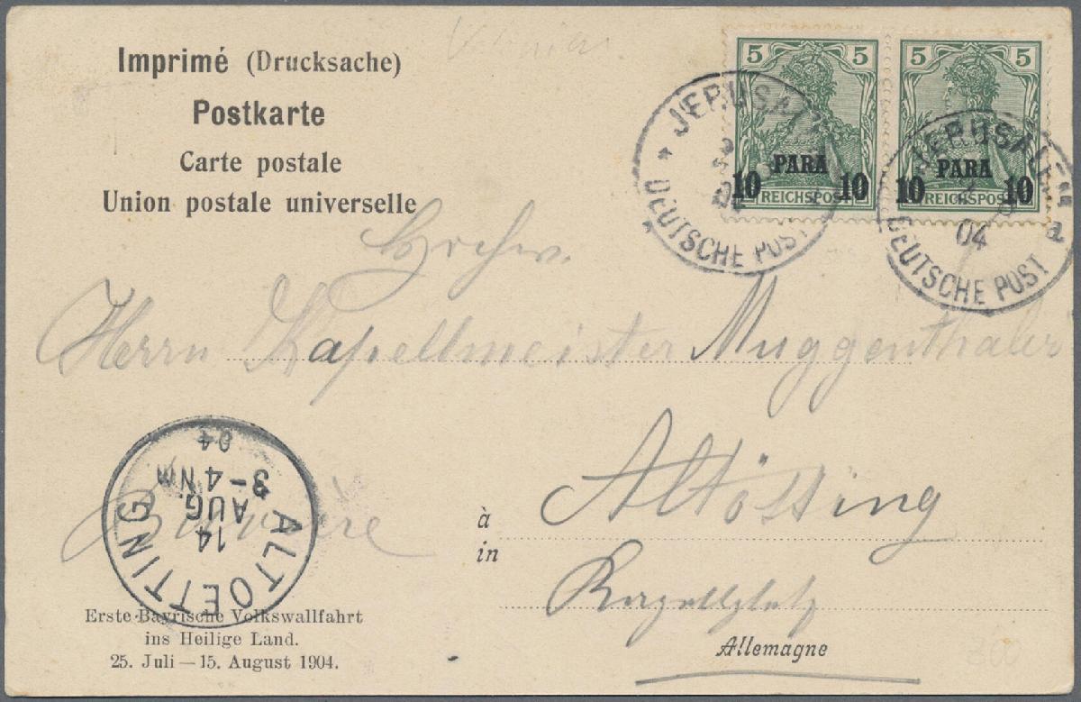 | Zusatzinformationen und Suchstichworte: | Christoph Gärtner 58. Auktion 19. - 23. Februar 2024 Los 10074 Deutsche Auslandspost Türkei 1900 Germania 10 Pa. auf 5 (Pf) im waagerechten Paar mit "verschieden hohem Aufdruck" (PF I), gebraucht auf Ansichtskarte von Jerusalem nach Altötting, sauber entwertet "JERUSALEM 2 8 04", und mit Ankunftstempel. Einige gebräunte Zahnspitzen, aber insgesamt gute Erhaltung Zuschlag 300,00 EUR |