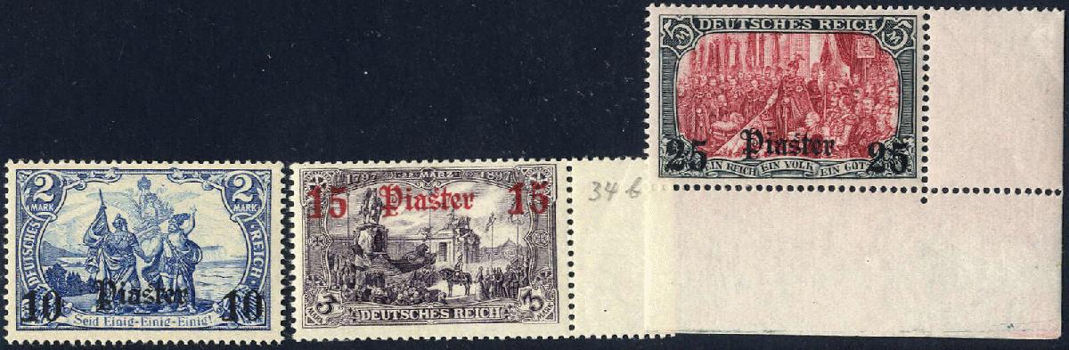 | Zusatzinformationen und Suchstichworte: | Viennafil 83. Live-Auktion 21. - 23. November 2023 Los 1633 Deutsche Auslandspost Türkei 1905, 3 Höchst-Werte Aufdruck Frakturtype ohne Wasserzeichen, postfrisch, Ausruf 250,00 EUR |