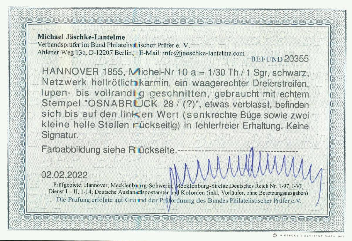 | Zusatzinformationen und Suchstichworte: | AAK Phila GmbH 81. Auktion 7. - 9. März 2024 Los 995 Altdeutschland Hannover 1/30 Th schwarz, Netzwerk hellrötl´karmin im waagr. 3er-Streifen lupen- bis vollrandig Ausruf 45,00 EUR |