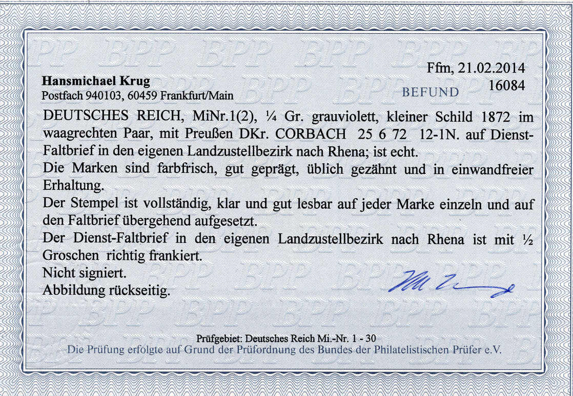 | Prüfgebiet: | Deutsches Reich 1871 - 1918 (Mi-Nr. 1 - 106) |
