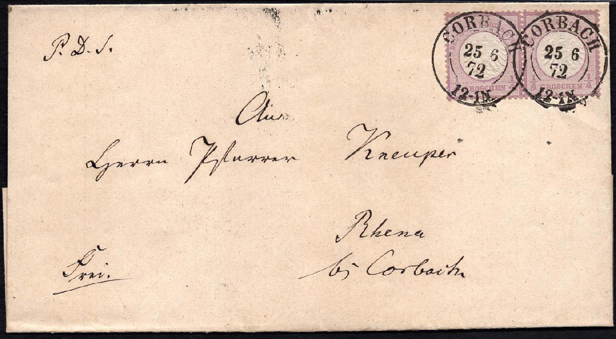 | Zusatzinformationen und Suchstichworte: | AAK Phila GmbH 81. Auktion 7. - 9. März 2024 Los 1717 Deutsches Reich, 1872 Kleiner Brustschild 1/4 Gr kl. Schild im waagr. Paar a. portoger. Dienst-Faltbf. v. CORBACH (Preußen-K2) n. Rhena (AKS) Ausruf 125,00 EUR |