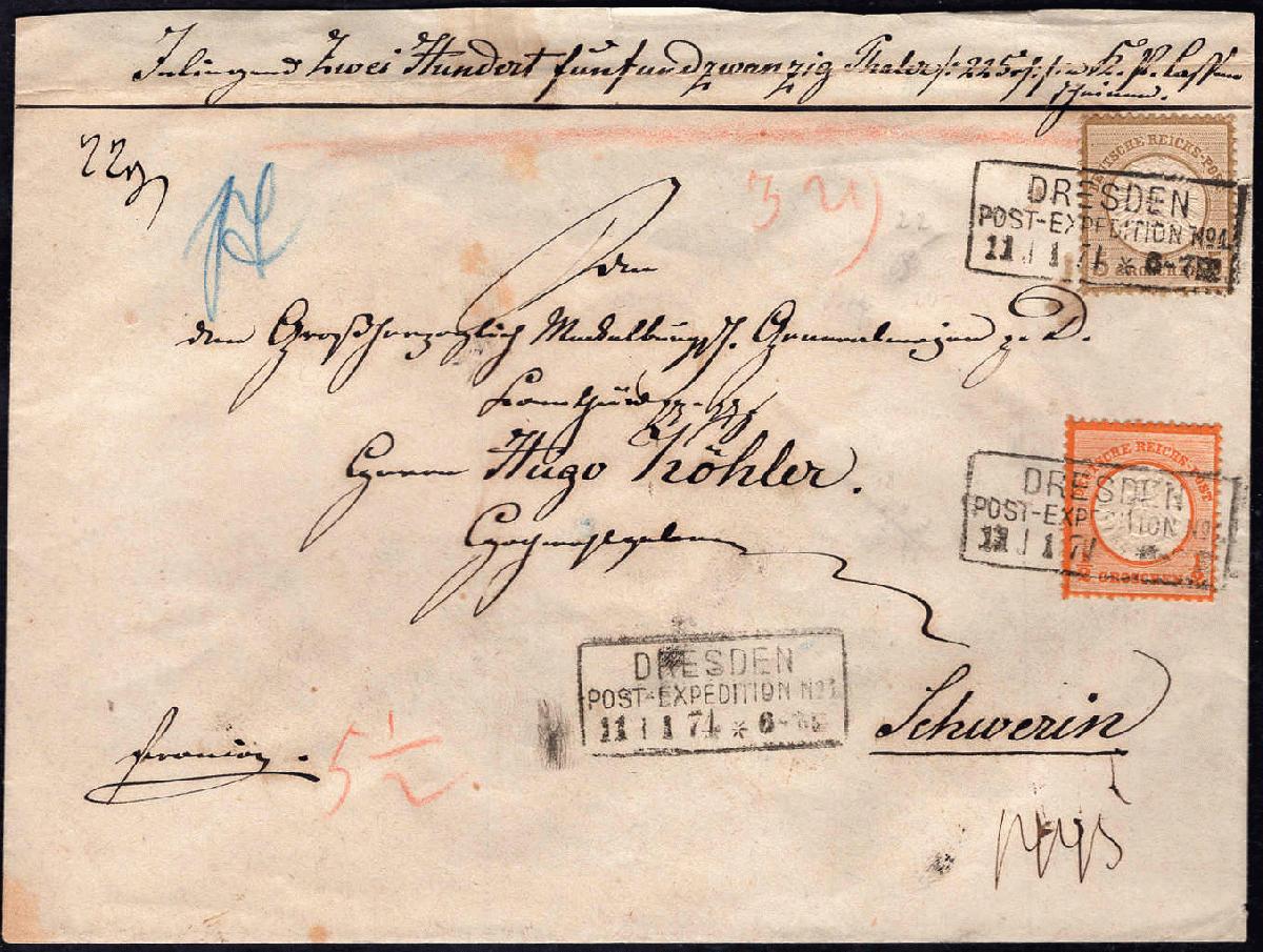 | Zusatzinformationen und Suchstichworte: | AAK Phila GmbH 81. Auktion 7. - 9. März 2024 Los 1807 Deutsches Reich 1/2 u. 5 Gr. gr. Schild als portoger. MiF a. Wertbf. v. Dresden n. Schwerin Ausruf 50,00 EUR |