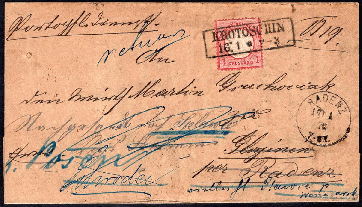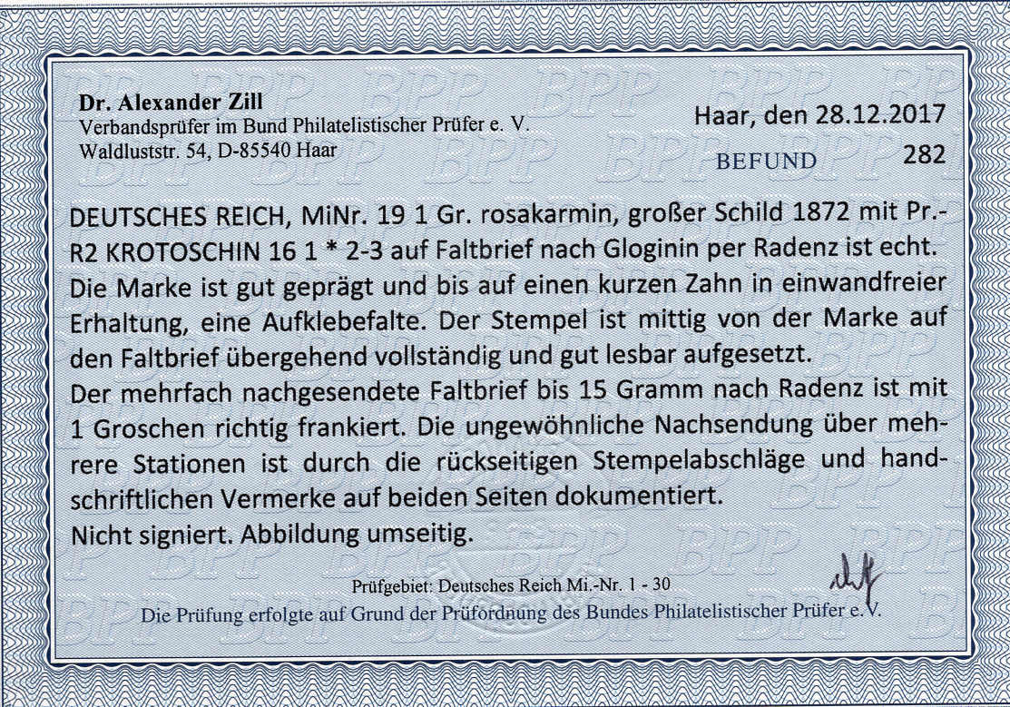 | Zusatzinformationen und Suchstichworte: | AAK Phila GmbH 81. Auktion 7. - 9. März 2024 Los 1822 Deutsches Reich, 1872 Grosser Brustschild 1 Gr gr. Schild als portoger. EF auf mehrfach nachgesendetem Faltbrief v. KROTOSCHIN (Ra2) n. Gloginin b. Radenz (AKS) Ausruf 50,00 EUR |