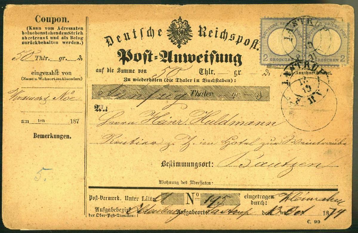 | Zusatzinformationen und Suchstichworte: | AAK Phila GmbH 81. Auktion 7. - 9. März 2024 Los 1827 Deutsches Reich, 1872 Grosser Brustschild 2 Gr gr. Schild im waagr. Paar (Mängel) a. Postschul-Postanweisung m. Übungsstpl. LASTRUP n. Bautzen Ausruf 40,00 EUR |