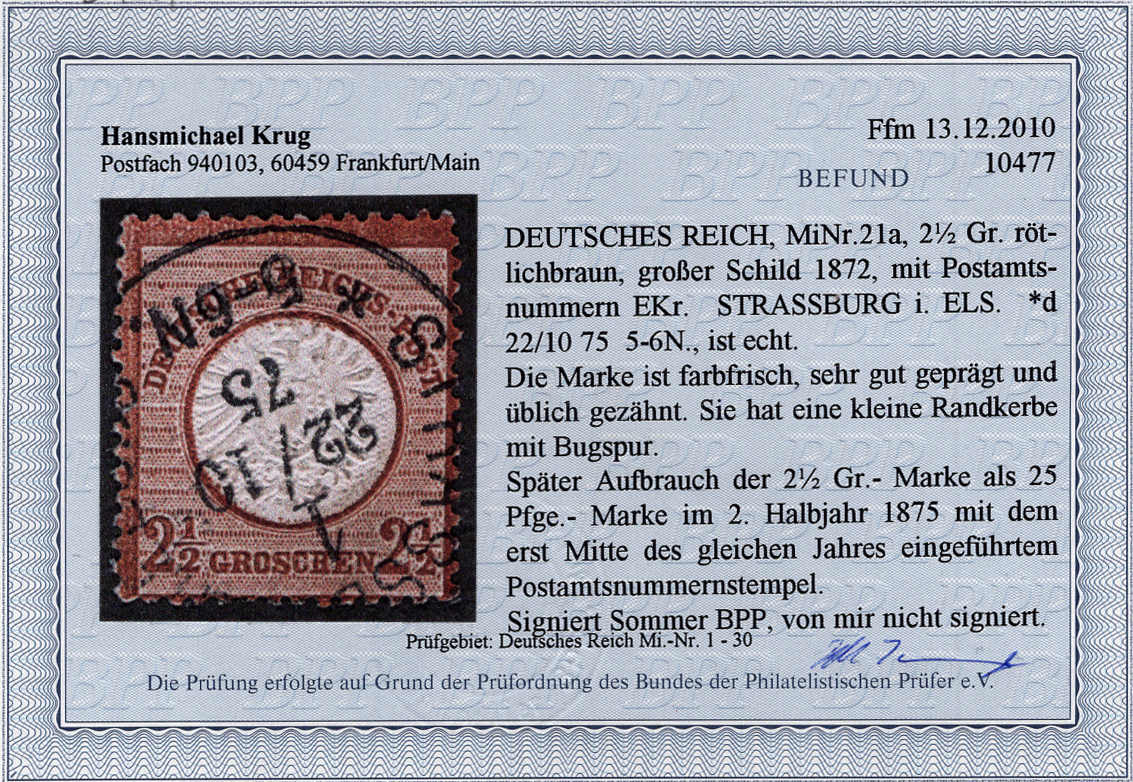 | Zusatzinformationen und Suchstichworte: | AAK Phila GmbH 81. Auktion 7. - 9. März 2024 Los 1834 (D) Deutsches Reich 2 1/2 Gr rötl´braun als später Aufbrauch als 25 Pf-Marke m. zentr. K1 STRASSBURG Ausruf 90,00 EUR |