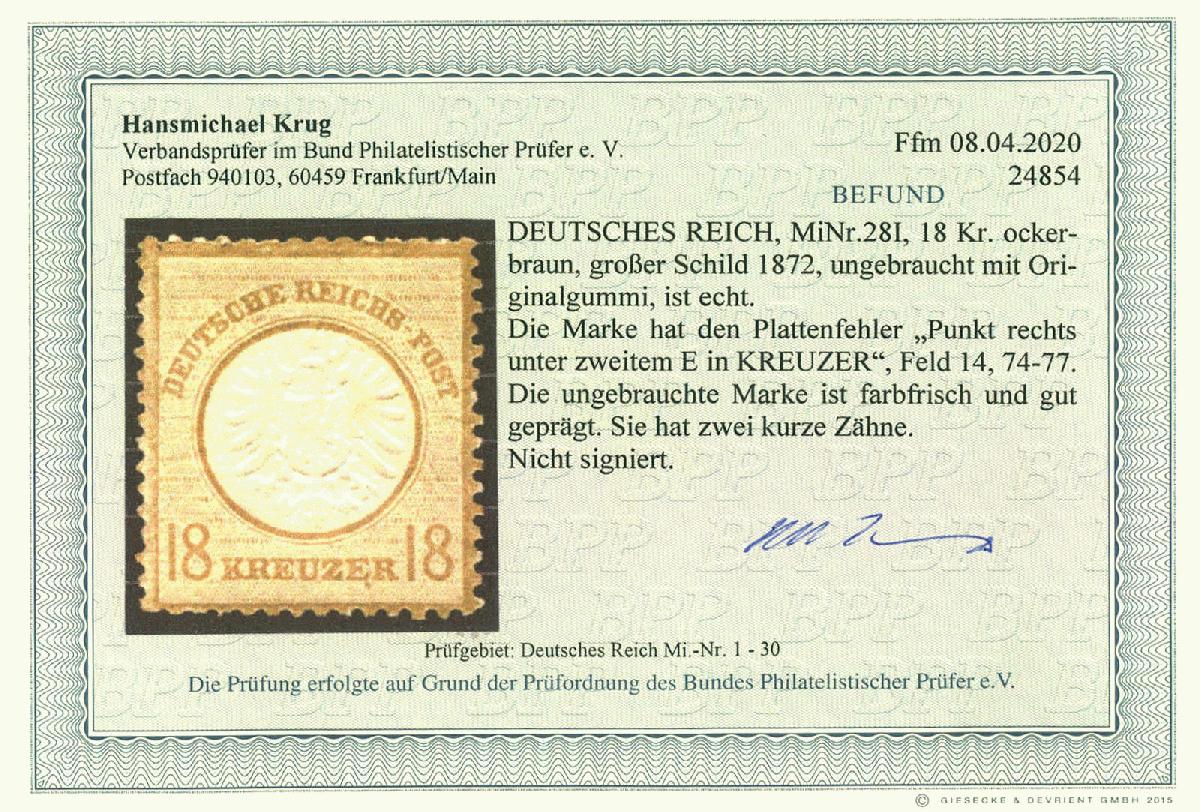 | Zusatzinformationen und Suchstichworte: | AAK Phila GmbH 81. Auktion 7. - 9. März 2024 Los 1875 Deutsches Reich 18 Kr gr. Schild m. PF "Pkt. unter 2. E", 2 kurze Zähne, sonst ungebr. Pracht Ausruf 30,00 EUR |
