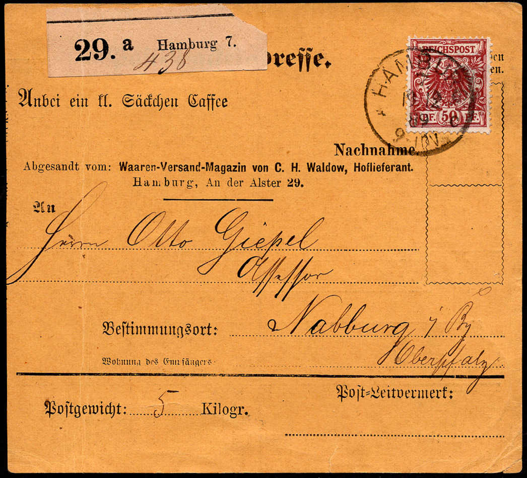 | Zusatzinformationen und Suchstichworte: | AAK Phila GmbH 81. Auktion 7. - 9. März 2024 Los 1898 Deutsches Reich 50 Pf bräunl´rot a. portoger. Paketkarte (übl. Spuren) v. HH n. Nabburg Ausruf 200,00 EUR |