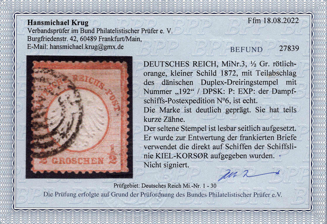 | Prüfgebiet: | Deutsches Reich 1871 - 1918 (Mi-Nr. 1 - 106) |