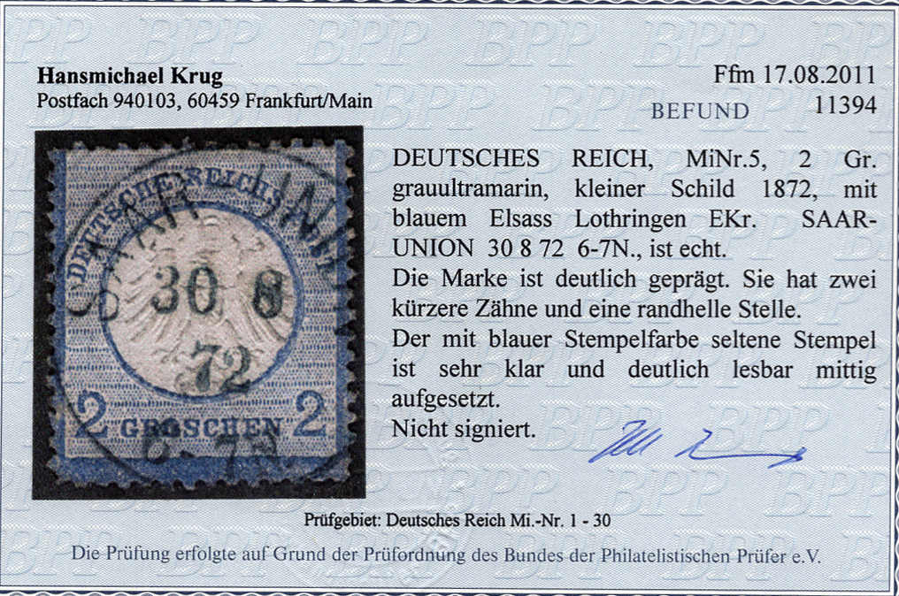 | Zusatzinformationen und Suchstichworte: | AAK Phila GmbH 81. Auktion 7. - 9. März 2024 Los 2964 Deutsches Reich SAAR-UNION, seltener blauer Elsaß-K1 m. echt, deutlich geprägt, 2 kürzere Zähne u. randhelle Stelle, seltener Stpl. Ausruf 25,00 EUR |