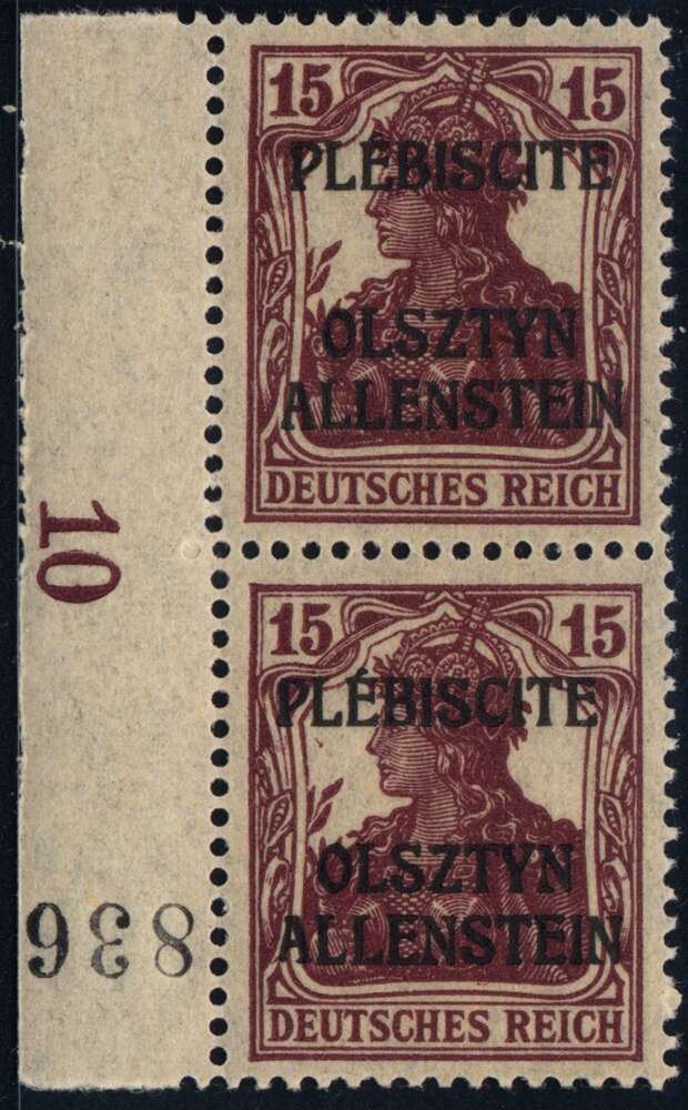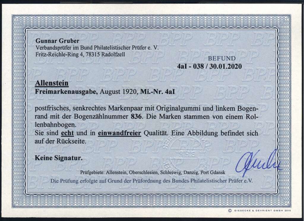 | Zusatzinformationen und Suchstichworte: | Uwe von Poblocki Los 0948701974 Allenstein 1920, sog. 'Siegesmarke', 15 Pfg. Germania mit Aufdruck aus ROLLENBAHNBOGEN, senkr. Paar mit kopfstehender Bogenzählnummer, einwandfrei postfrisch ohne Signaturen, Befund Gruber BPP, Mi€ -,- Festpreis 175,00 EUR |
