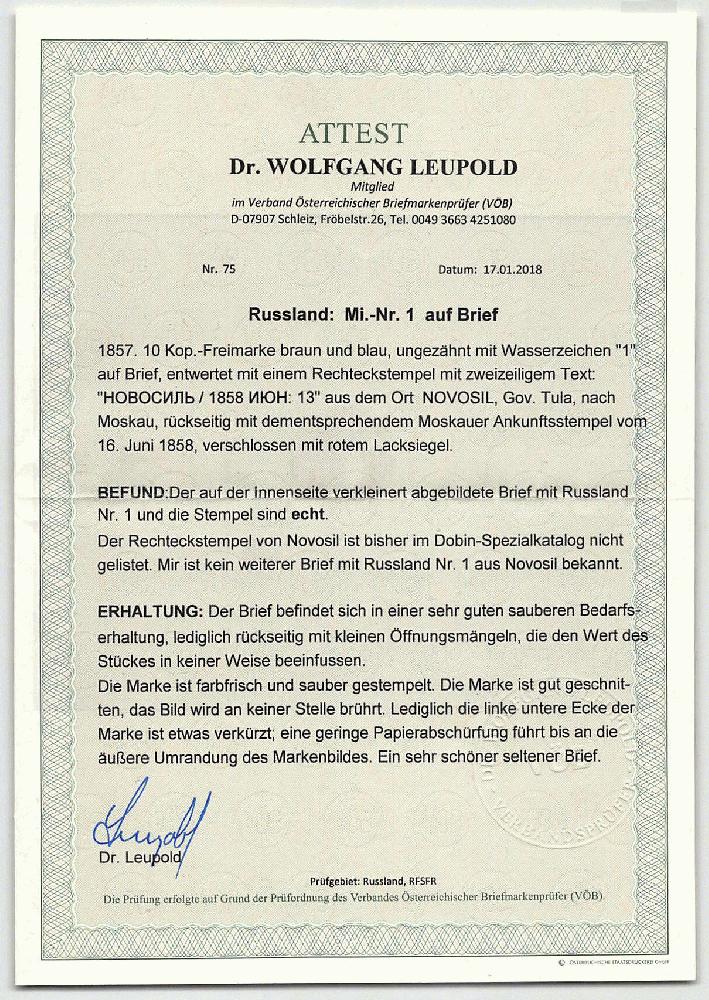 | Zusatzinformationen und Suchstichworte: | WebShop Los 0000102282 Russland 1857-58 1. Ausgabe (Mi. 1) NOWOSIL / NOVOSIL - MOSKAU / MOSCOW: 10 Kop. dunkelbraun/hellblau, voll- bis breitrandig auf Brief mit bisher unbekanntem Vorphila-Stempel "NOWOSIL, 1858 JUNI 13" nach Moskau (Ankunftsstempel vom 16. Juni). Eine minime Papierabschürfung nur im Außenrand berührt das Markenbild nicht und ist zu vernachlässigen. Ein großartiger und in dieser Form einmaliger Brief mit der ersten russischen Marke Festpreis 10.000,00 EUR |