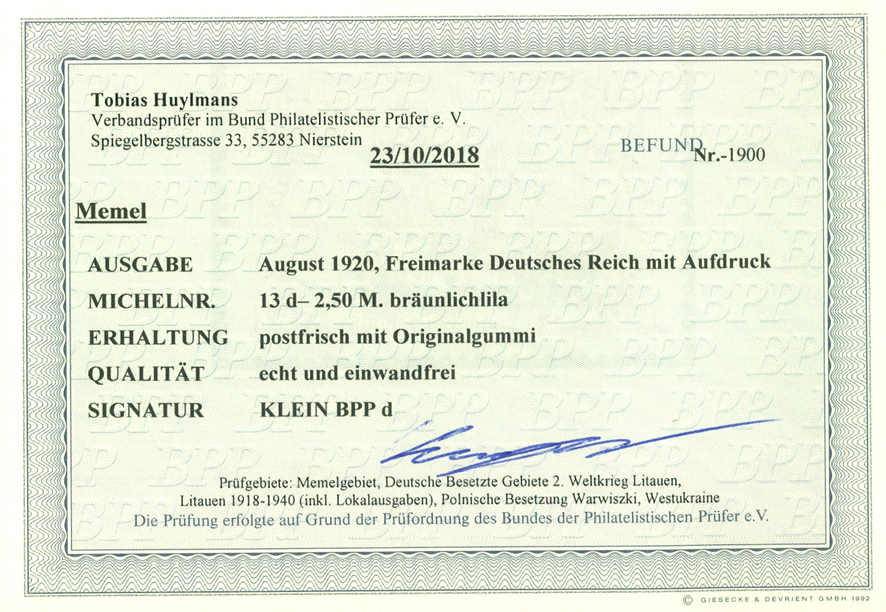 | Prüfer: | Huylmans, Tobias (BPP (Bund Philatelistischer Prüfer)) |