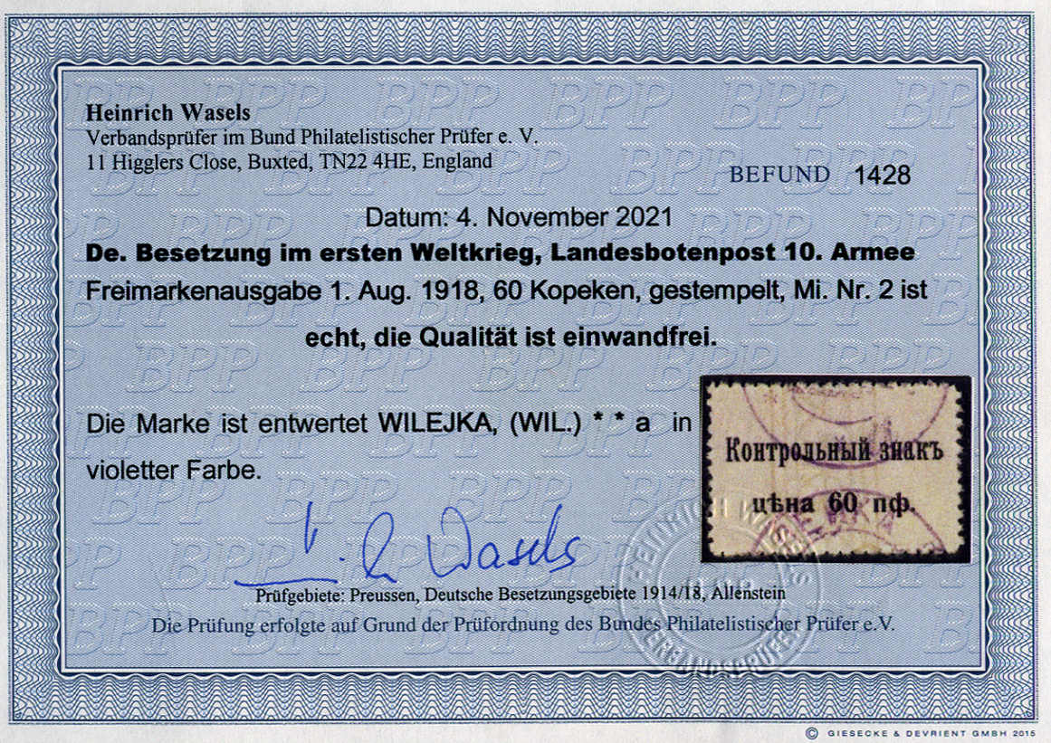 | Prüfgebiet: | Deutsche Besetzung WK 1 Postgebiet Ober Ost Landesbotenpost |
