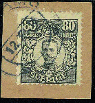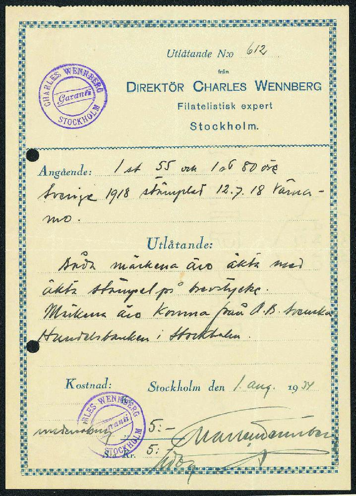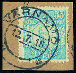 | Zusatzinformationen und Suchstichworte: | Gert Müller 121. Auktion 22. Februar 2024 Los 3530 Schweden 1912-1944 DIE VÄRNAMO-SERIE: 55 Öre hellblau und 80 Öre schwarz, König Gustav V. 1918, die sehr seltene sogenannte "VÄRNAMO-SERIE", farbfrisch und sehr gut gezähnt auf zwei wunderschönen Briefstücken mit zwei klaren K2 "VÄRNAMO 12.7.18." echt und zeitgerecht gest. Die Gesamtauflage belief sich auf lediglich 1000 Serien, wovon nur ganz wenige Sätze gestempelt wurden. Ein Luxussatz dieser großen Schweden-Seltenheit, die in fast allen Sammlungen fehlt! Ausruf 8.000,00 EUR |