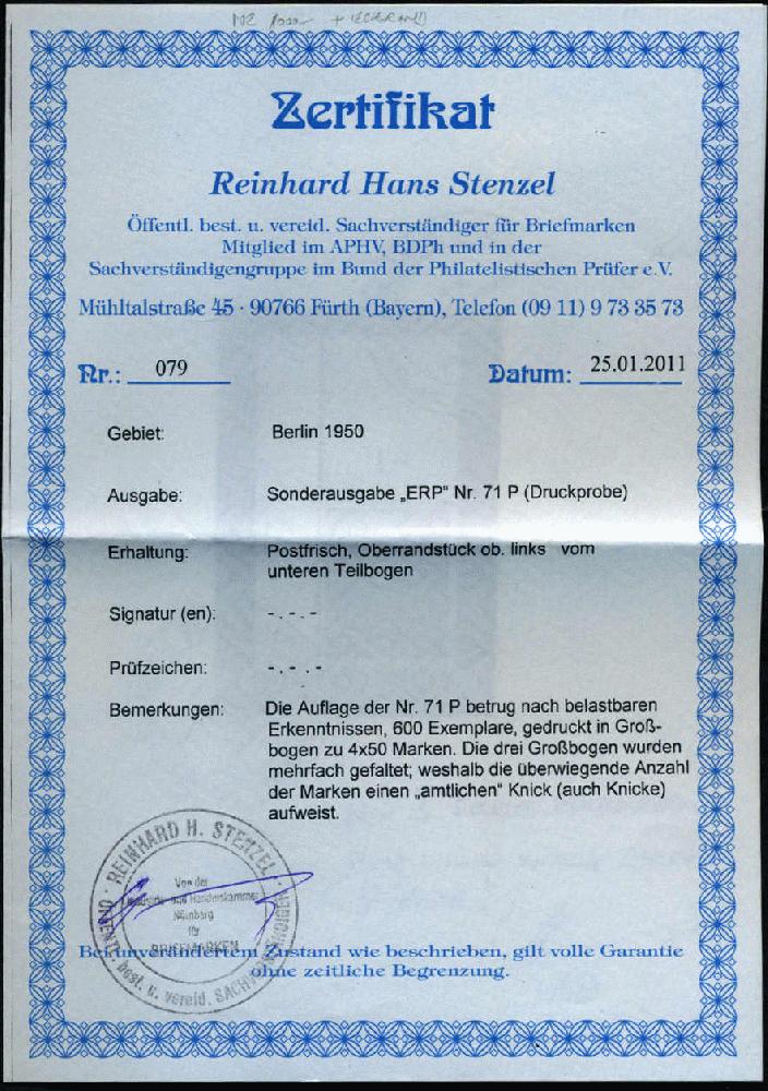 | Zusatzinformationen und Suchstichworte: | AAK Phila GmbH 81. Auktion 7. - 9. März 2024 Los 8285 Berlin 20 ERP als Probedruck in lilabraun li.o.Ecke m. oben anhängendem Leerfeld, postfr. Pracht m. waagr. Knick (durch Großbogenfaltung), Ausruf 250,00 EUR |