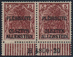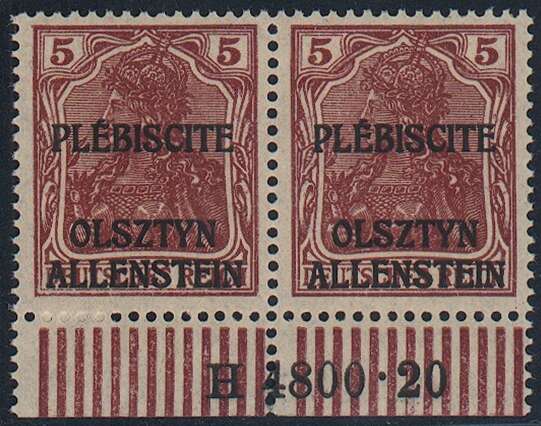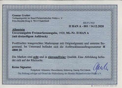 | Zusatzinformationen und Suchstichworte: | Uwe von Poblocki Los 0948701354 Allenstein 1920, UNVERAUSGABTE Freimarke 5 Pfg. Germania mit 3zeiligem-Aufdruck im waagerechten Unterrandpaar mit Aufdruck-HAN 'H 4800.20', rückseitig interessanter Teilabklatsch der HAN, einwandfrei postfrisch und ungefaltet mit Fotobefund Gruber BPP, Mi€ 600,- Festpreis 150,00 EUR |