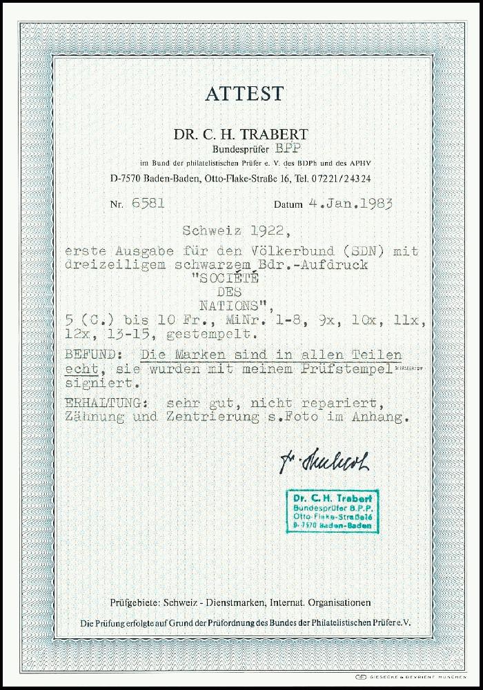 | Zusatzinformationen und Suchstichworte: | Dr. Reinhard Fischer 196. Auktion 1. - 3. Februar 2024 Los 9337 Schweiz Völkerbund SDN 1922, 5 Rp. bis 10 Fr. Freimarken der Schweiz mit Aufdruck !Societe des Nations", kompletter Satz mit 15 Werten, gestempelt, tadellos Ausruf 100,00 EUR |