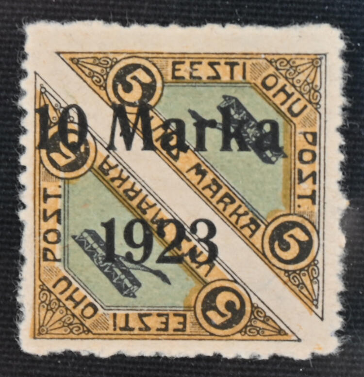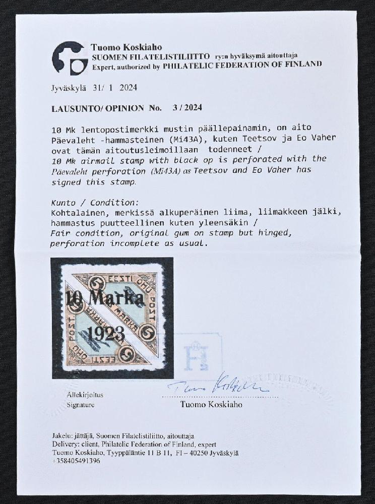 | Zusatzinformationen und Suchstichworte: | Hellman 131. Auktion 13. - 16. März 2024 Los 1619 Estland 1923 Flugpost 10 markka Mi 43A, ungebraucht * seltene Marke mit Päevaleht Zähnung, nur 400 Briefmarken verausgabt! Anständig Erhaltung, typische Zähnung. Ausruf 300,00 EUR |