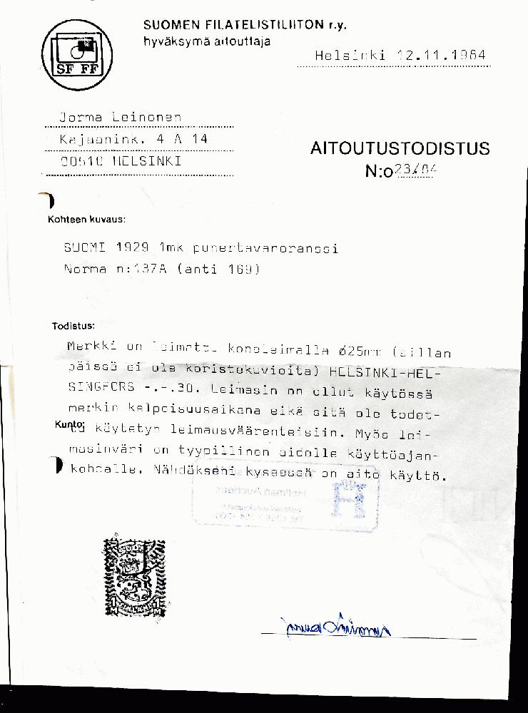 | Prüfer: | Leinonen, Jorma (Suomen Filatelistiliiton r.y. (Finnischer Philatelistenverba) |