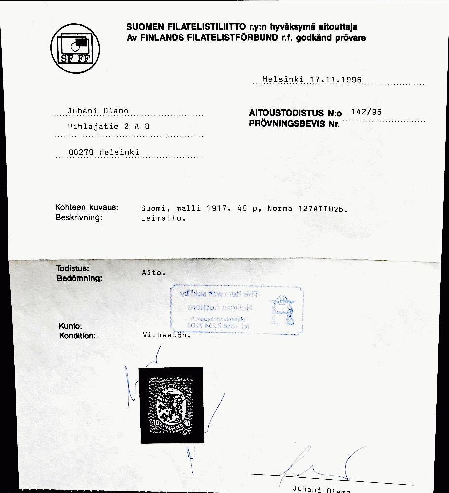 | Prüfer: | Olamo, Juhani (Suomen Filatelistiliiton r.y. (Finnischer Philatelistenverba) |