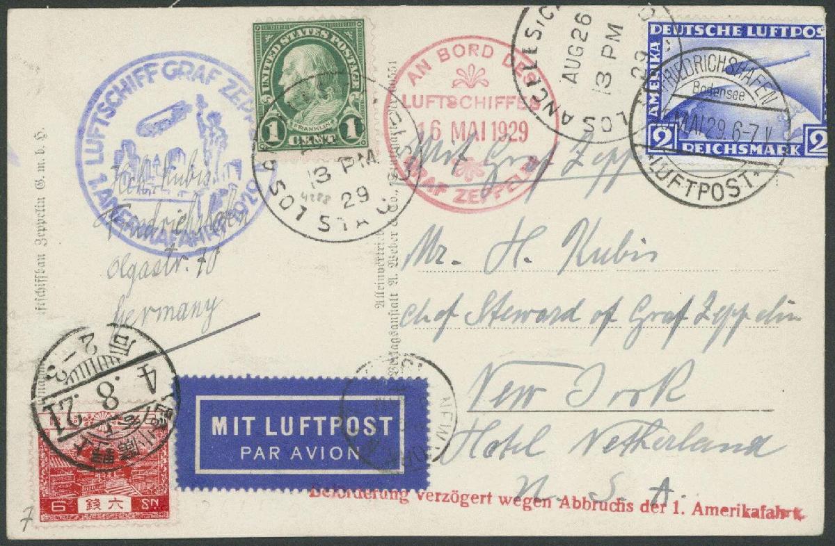 | Zusatzinformationen und Suchstichworte: | Ulrich Felzmann 180. Auktion 13. März 2024 Los 393 Deutsches Reich, 1872 Grosser Brustschild Amerikafahrt und Weltrundfahrt 1929, Fotokarte ab Friedrichshafen 15.5. mit um den Rand geklebter 2 RM Zeppelinmarke, nebengesetzt roter Bordstempel 16.5. und Ausfallstempel, dann Beförderung mit der Amerikafahrt mit blauem Bestätigungsstempel an Besatzungsmitglied und Chef-Steward H. Kubis nach New York 5.8., welcher die Karte nach Tokyo 21.8. und Los Angeles 26.8. im eigenen Gepäck beförderte, sehr seltene Variante Ausruf 1.500,00 EUR |