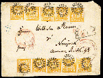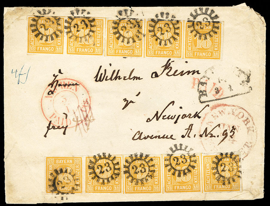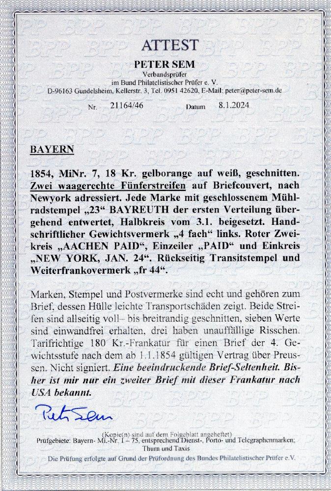 | Zusatzinformationen und Suchstichworte: | Cherrystone - Seltene Marken & Postgeschichte weltweit 12. - 13. März 2024 Los 420 Altdeutschland Bayern 1850 18kr yellow orange, two horizontal strips of five, margins all around, canceled by 10 clear strikes of "23" numerals of Bayreuth, paying 180kr on cover used in 1854 to New York, with semi-circle Bayreuth 3.1. departure pmk, red "Aachen Paid", another "Paid" hs alongside, New York (Jan 24) arrival, Berlin transit datestamp on back. Seven stamps are absolutely sound, others are affected by inconspicuous paper splits and cover wear, some back-cover defects, fine and impressive rarity from Bavaria, with 2024 Peter Sem certificate ("Only one other cover known to me with this franking") (Mi.€15,000 for two used strips of four, unpriced as two strips of five, especially on cover) Ausruf 14.000,00 EUR |