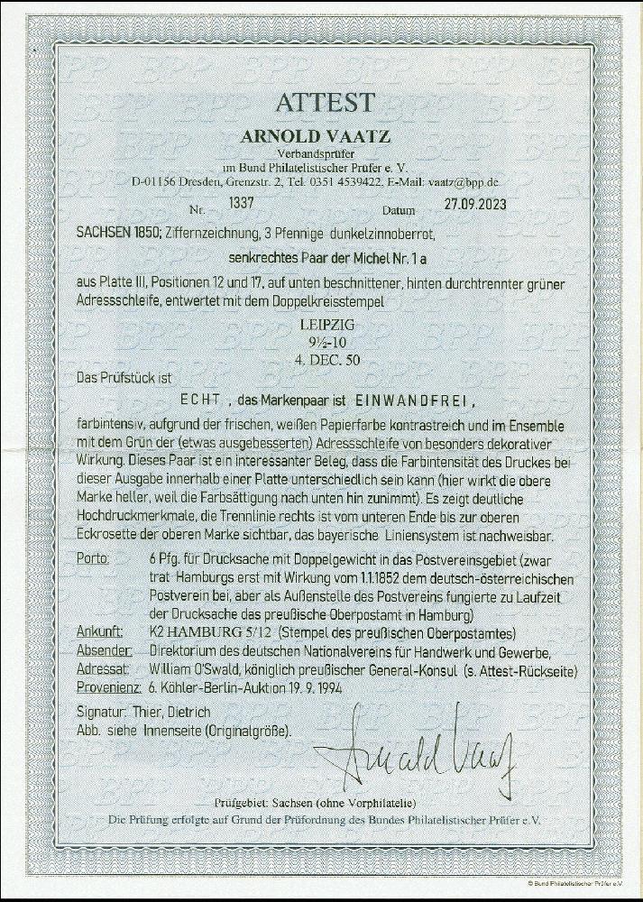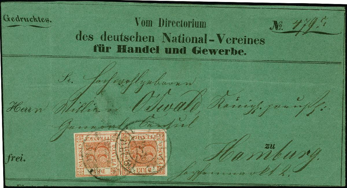 | Zusatzinformationen und Suchstichworte: | 383. Auktion Heinrich Köhler 14.–15. & 18.–23. März 2024 Los 3956 Altdeutschland Hamburg 3 Pfg. dunkelzinnoberrot im senkrechten Paar, Platte III, Pos. 12 und 17, sehr schöne tiefe Farbe und gut voll- bis sehr breitrandig, mit sauber aufgesetztem DKr. "LEIPZIG 4 DEC. 50" auf grüner Drucksachenschleife "Vom Directorium des deutschen National-Vereines für Handel und Gewerbe" an den königlich preußischen Generalkonsul Oswald in Hamburg, mit Eingangsstempel des preußischen Postamtes. Leichte Faltungen außerhalb der Frankatur, sonst tadellose und sehr frische Erhaltung. Ein sehr attraktives und seltenes Stück vor Eintritt Hamburgs in den Postverein Ausruf 12.000,00 EUR |