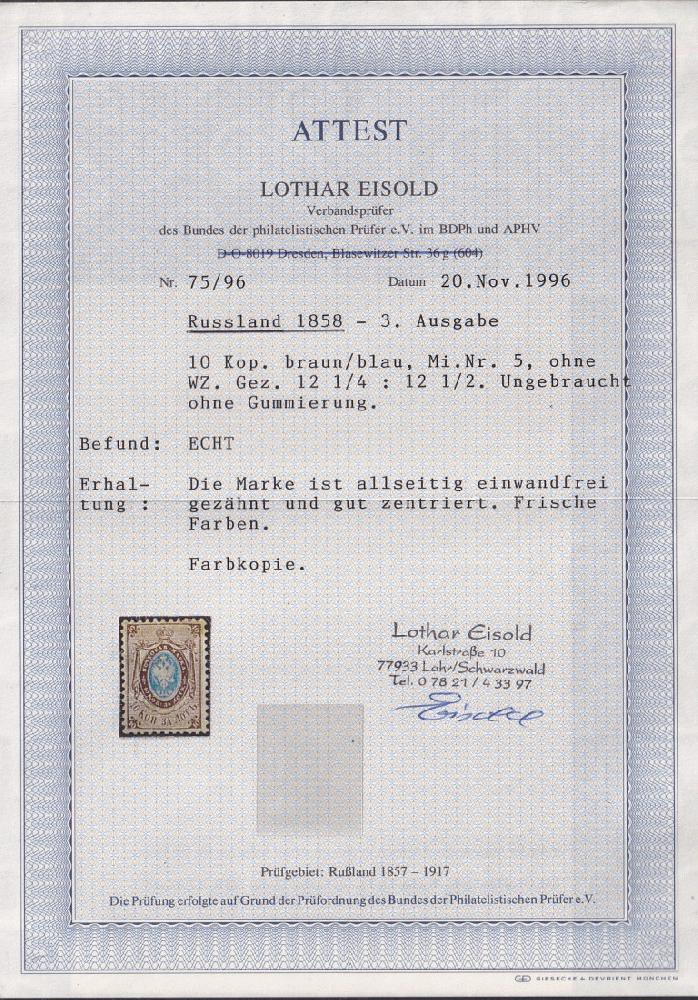 | Zusatzinformationen und Suchstichworte: | delcampe.net Russland,1858, Mi.-Nr. 5, ungebraucht ohne Gummi Ausruf 100,00 EUR |