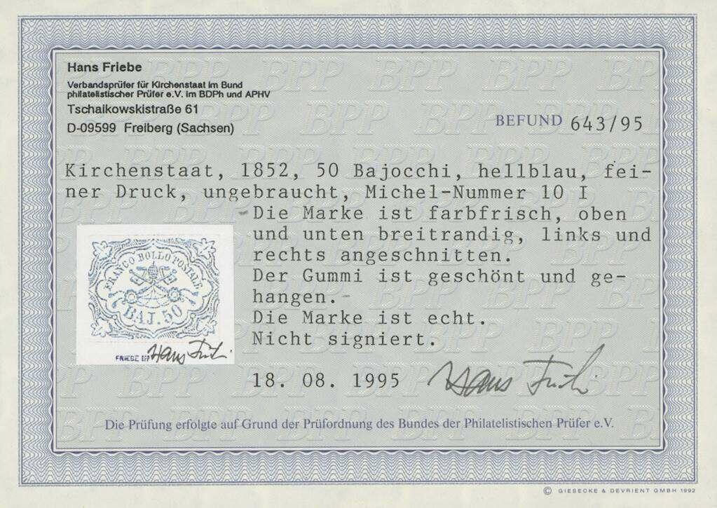 | Zusatzinformationen und Suchstichworte: | Ulrich Felzmann 180. Auktion 14. März 2024 Los 2149 Italien Staaten Kirchenstaat 50 B hellblau, feiner Druck der Frühausgabe, ungebraucht mit aufgefrischtem Originalgummi, lediglich links und rechts tangiert, oben und unten breitrandig sowie sehr schön farbfrisch, Ausruf 1.000,00 EUR |