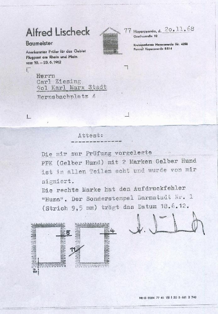 | Zusatzinformationen und Suchstichworte: | AAK Phila GmbH 81. Auktion 7. - 9. März 2024 Los 3080 Deutsches Reich 1912 Flugpost Rhein-Main, sogen. "Gelber Hund" 2x a. oranger Palais-Karte, dabei 1x Aufdruckfehler "Huna", Pracht Zuschlag 150,00 EUR |