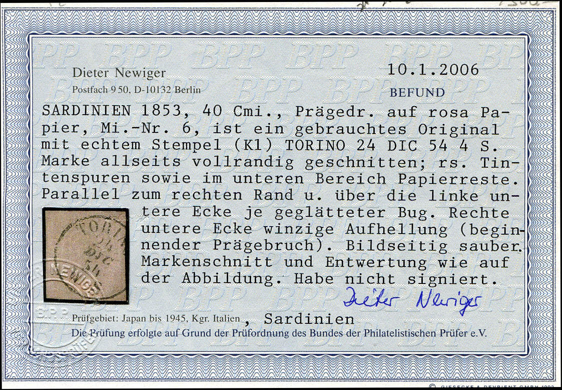| Zusatzinformationen und Suchstichworte: | Cherrystone - Webshop Los 68216 Italien Staaten Sardinien 1853 40c pale rode, Torino (1854) cancel, light creases and small flaws Festpreis 225,00 UD |