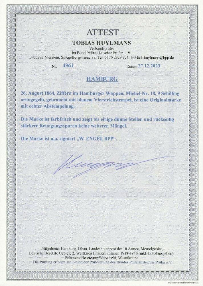 | Zusatzinformationen und Suchstichworte: | Ulrich Felzmann 180. Auktion 14. März 2024 Los 2632 Altdeutschland Hamburg 9 S orangegelb in sehr schön kräftiger Farbe, bis auf dünne Stellchen sowie rs. Reinigungsspuren fehlerfrei, ringsum tadellos vollzähnig mit ideal klar aufsitzendem, blauem Vierstrichstempel in äußerst attraktiver Gesamterhaltung Ausruf 400,00 EUR |