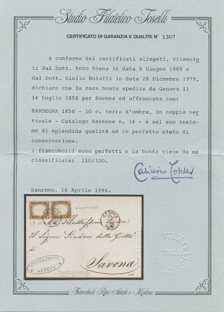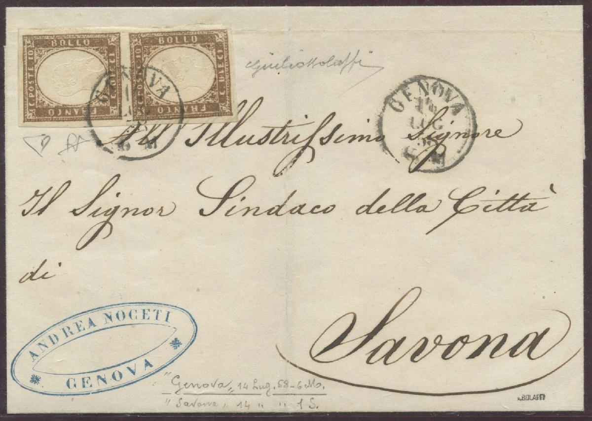 | Zusatzinformationen und Suchstichworte: | Bertolami Fine Arts 284. Web-Auktion 12. Januar 2024 Los 201 Italien Staaten Sardinien 14.06.1858 Lettere da Genova per Savona affrancata per 20 centesimi tramite una coppia di 10 cent. Terra D'ombra n.14 Zuschlag 550,00 EUE |